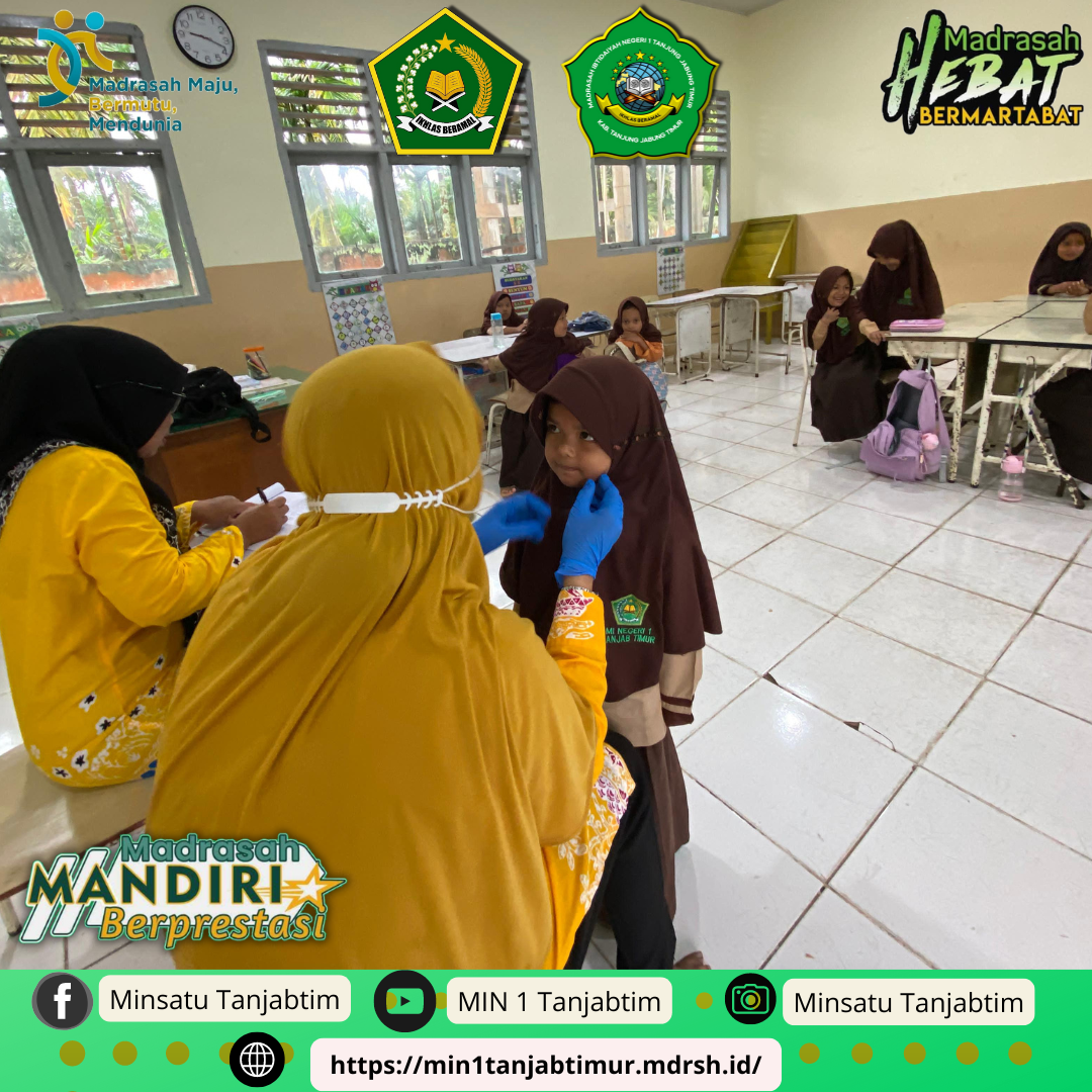 Rantau Rasau,MIN 1 Tanjab Timur - Puskesmas Kecamatan Rantau Rasau lakukan pemeriksaan dan edukasi kebersihan gigi dan mulut siswa siswi kelas I Madrasah Ibtidayah Negeri (MIN) 1 Tanjab Timur.