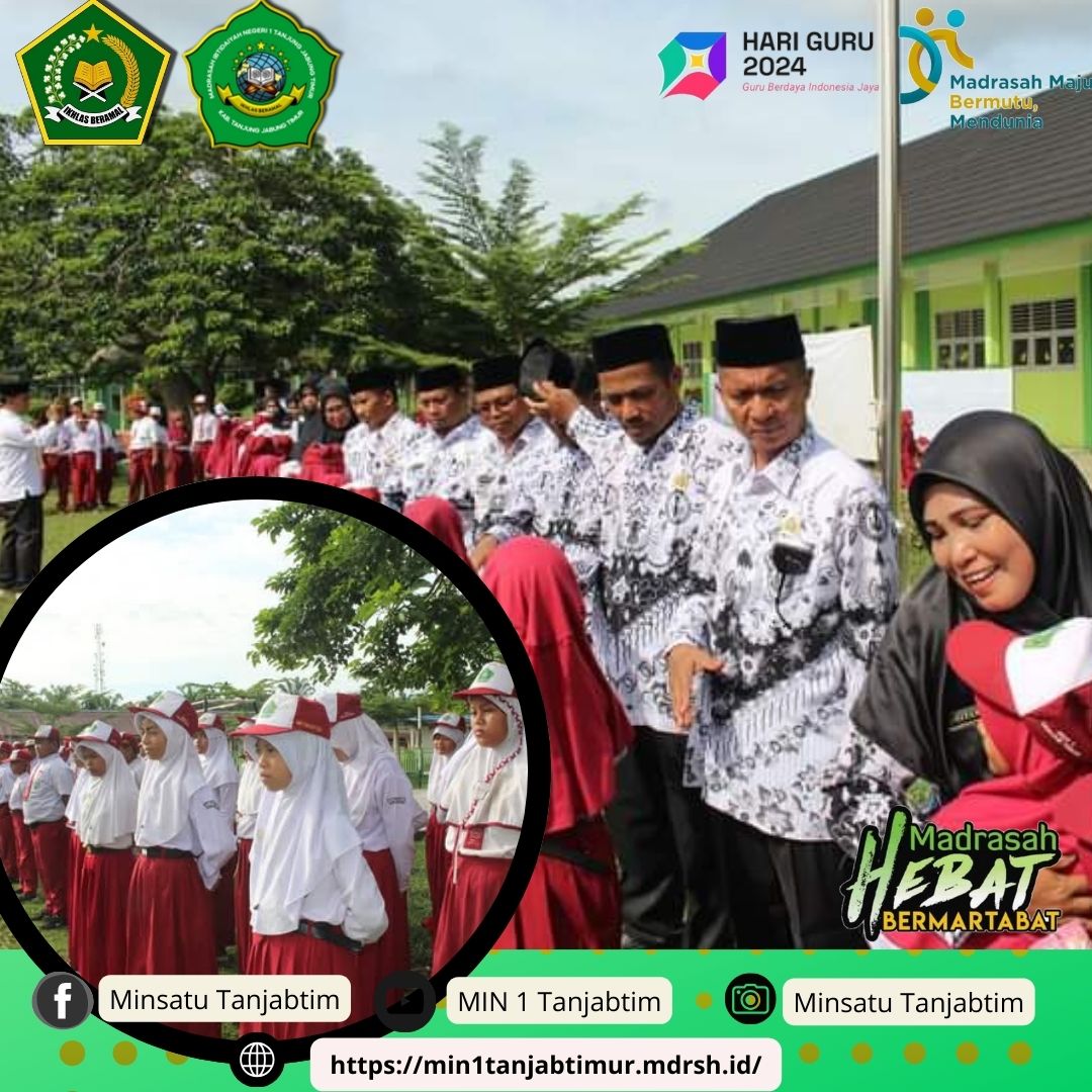 Rantau Rasau, MIN 1 Tanjab Timur - Dalam upacara Hari Guru Nasional tahun 2024, di Madrasah Ibtidayah Negeri (MIN) 1 Tanjab Timur Senin (25/11/2024l), Kepala MIN 1 Tanjab Timur, Aziz,S.Pd berpesan kepada seluruh peserta didik untuk menghormati guru dan berakhlak mulia.