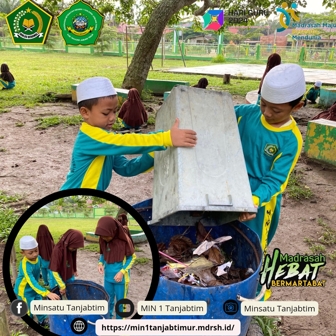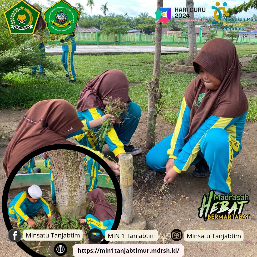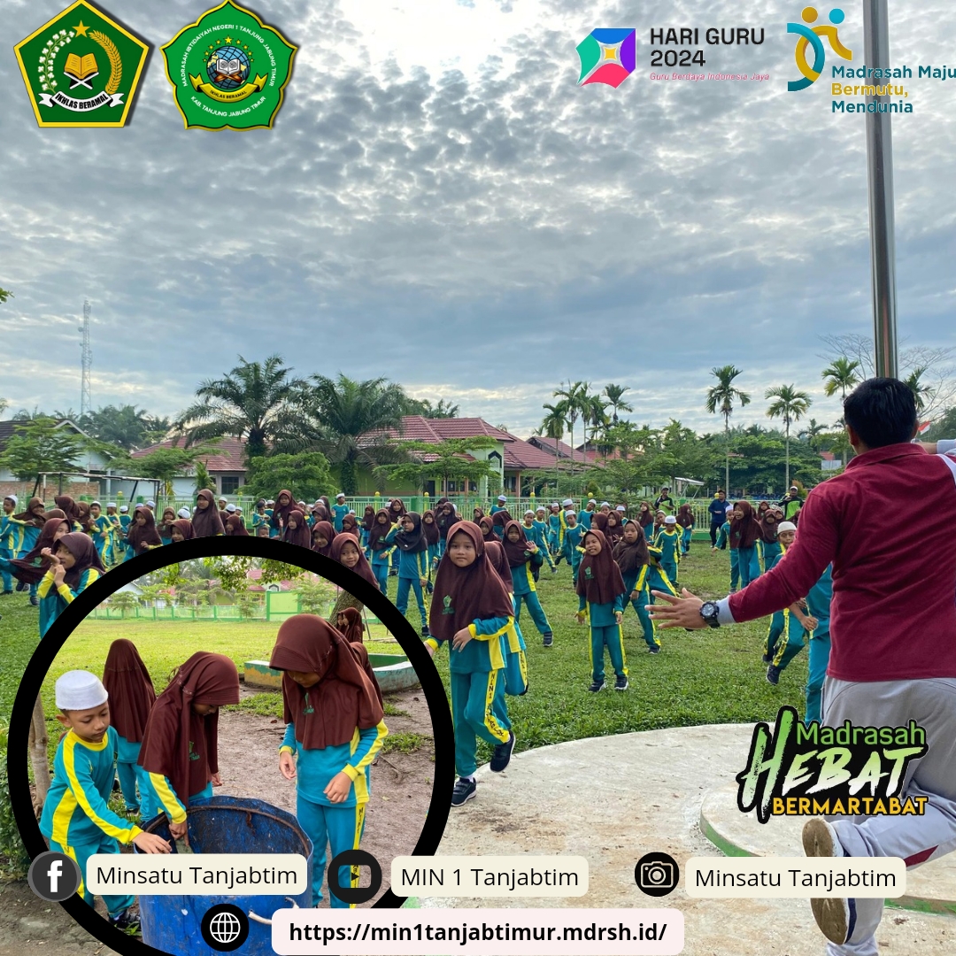 "Iya setiap Sabtu habis senam sehat, anak anak selalu kita ajarkan untuk berfotong royong membersihkan area madrasah, sehingga selain lingkungan madrasah menjadi asri dan bersih, mereka juga dapat belajar bekerjasama," ujar Kepala MIN 1 Tanjab Timur, Aziz,S.Pd.