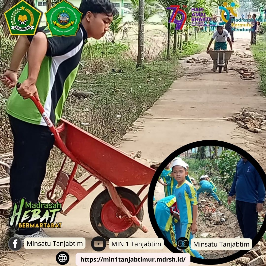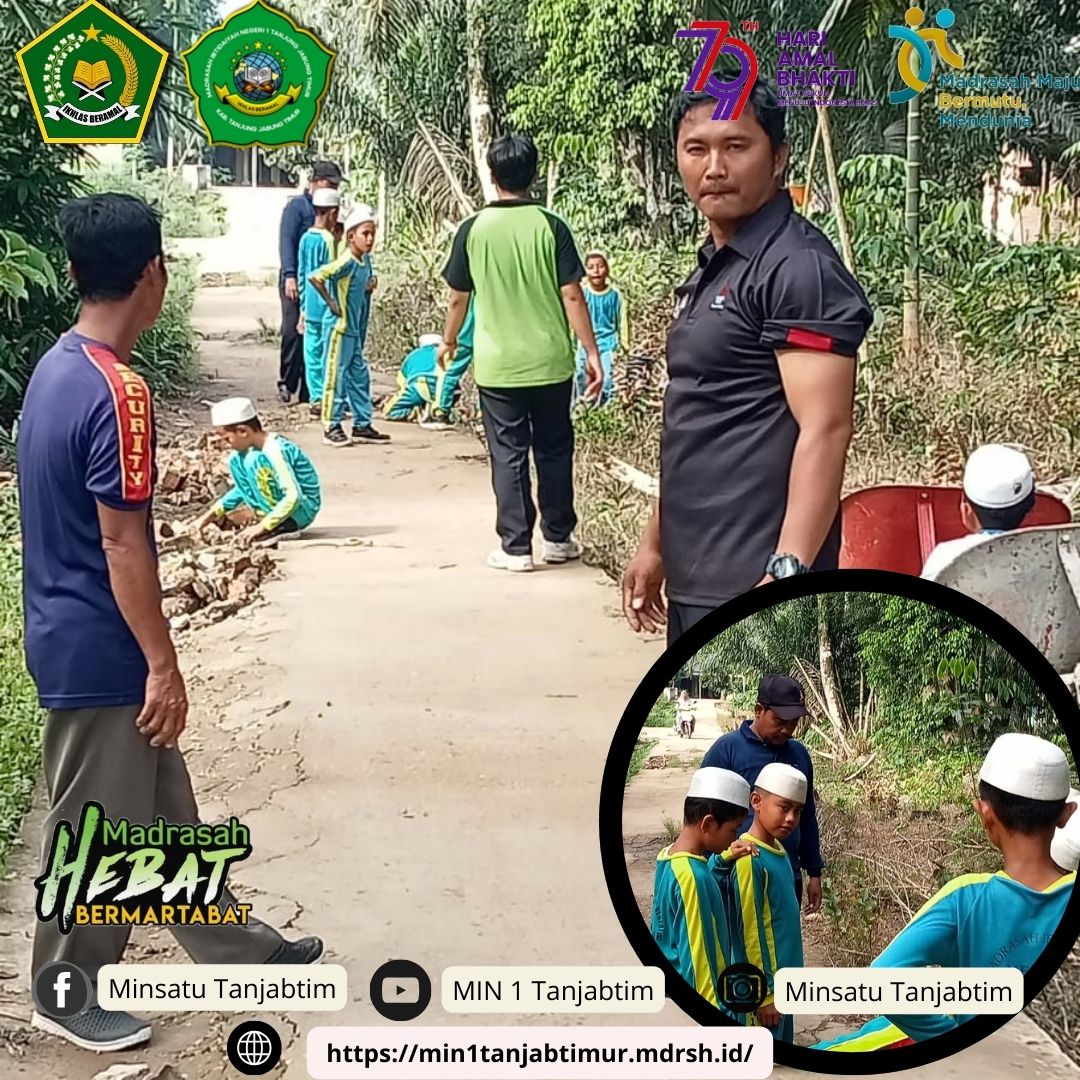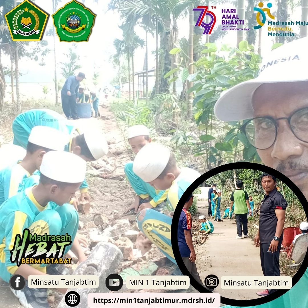 Rantau Rasau,MIN 1 Tanjab Timur - Dalam rangka turut memeriahkan Hari Amal Bakti (HAB) yang ke 79, Majelis Guru beserta siswa siswi Madrasah Ibtidayah Negeri (MIN) 1 Tanjab Timur Sabtu (14/12/2024) melakukan kerja bakti membersihkan dan menambal jalan rusak disekitar MIN 1 Tanjab Timur.