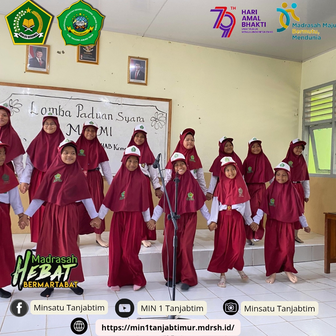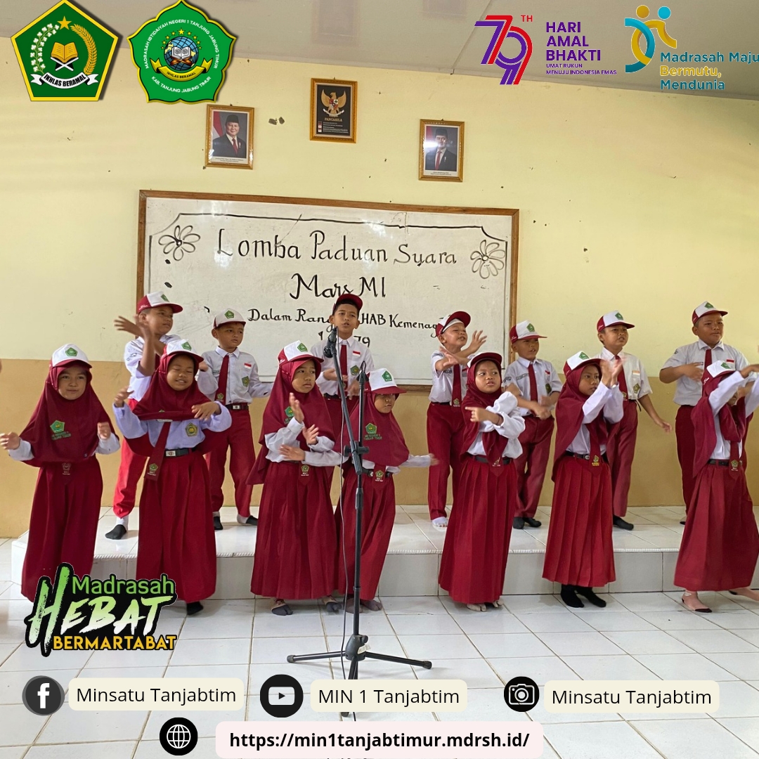 Rantau Rasau,MIN 1 Tanjab Timur - Salah satu kegiatan Madrasah Ibtidayah Negeri (MIN) 1 Tanjab Timur dalam rangka memeriahkan Hari Amal Bakti (HAB) Kementrian Agama yang ke 79 ialah lomba paduan suara mars madrasah. Dimana pada lomba tersebut siswa siswi MIN 1 Tanjab Timur menyanyikan mars madrasah secara berkelompok.