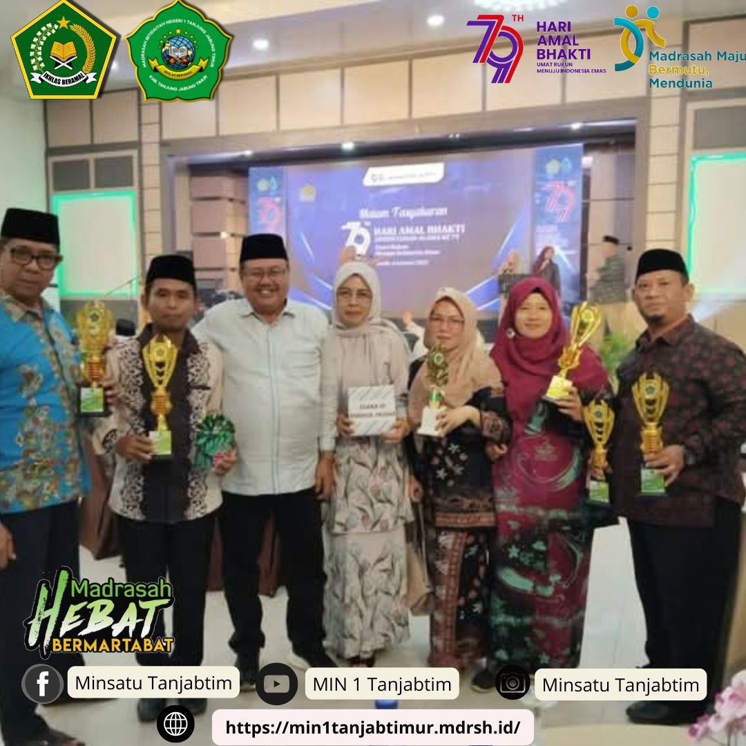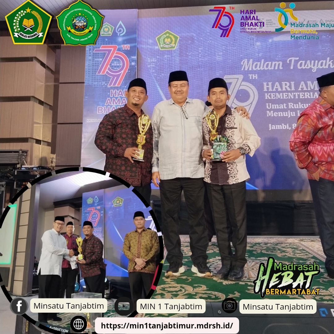 Jambi,MIN 1 Tanjab Timur - Pada malam tasyakuran Hari Amal Bhakti (HAB) ke 79 Kantor Wilayah Kementrian Agama (Kanwil Kemenag) Provinsi Jambi Rabu (8/1/2025) malam di Asrama Haji Provinsi Jambi, selain ceramah agama dan doa bersama juga diberikan penghargaan untuk pengelolaan website terbaik di tingkat Provinsi Jambi dan Madrasah Ibtidayah Negeri (MIN) 1 Tanjab Timur berhasil menyabet tiga penghargaan dari tiga kategori.