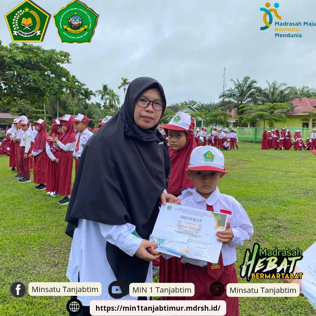 "Alhamdulillah hari ini kita bisa melaksanakan upacara dan juga dapat menyerahkan penghargaan bagi siswa siswi terbaik tahfiz dari setiap kelas, dimana seyogyanya penghargaan ini kita berikan saat penerimaan raport, akan tetapi dikarenakan saar itu hujan, maka penghargaan ini ditunda dan baru dapat terlaksan saat ini," ujar Kepala MIN 1 Tanjab Timur, Aziz,S.Pd melalui Koordinator Tahfiz, Hj.Mardiah,S.Pd.I.