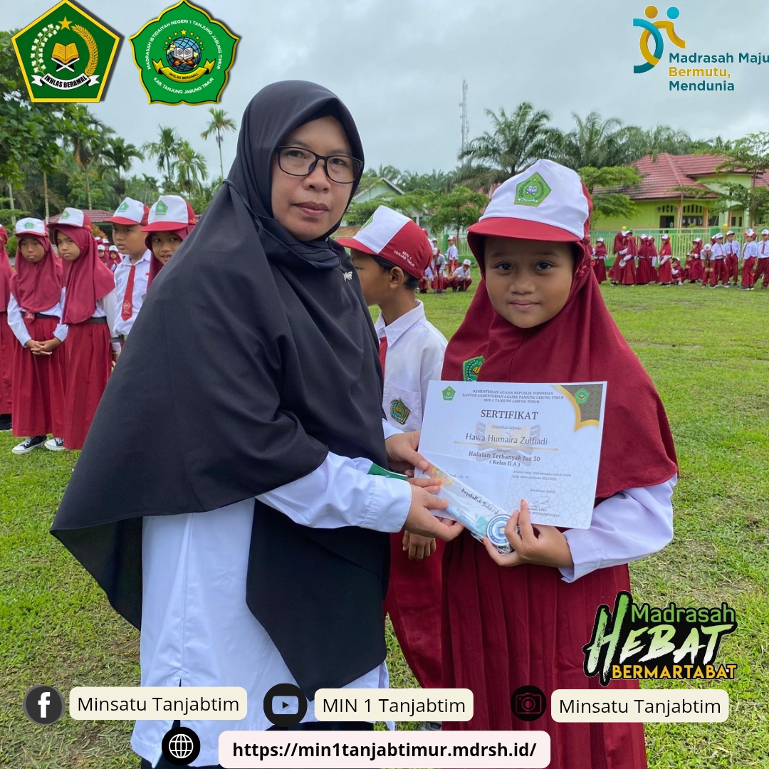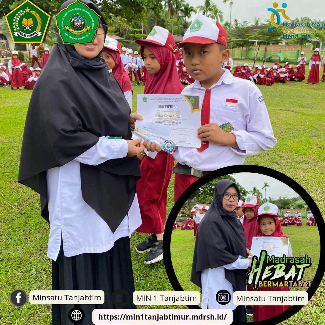 Rantau Rasau, MIN 1 Tanjab Timur - Usai upacara bendera Senin(13/1/2025), Madrasah Ibtidayah Negeri (MIN) 1 Tanjab Timur menyerahkan penghargaan tahfiz bagi siswa siswi terbaik tahfiz dari setiap kelas.