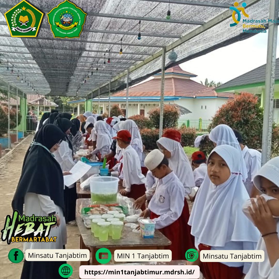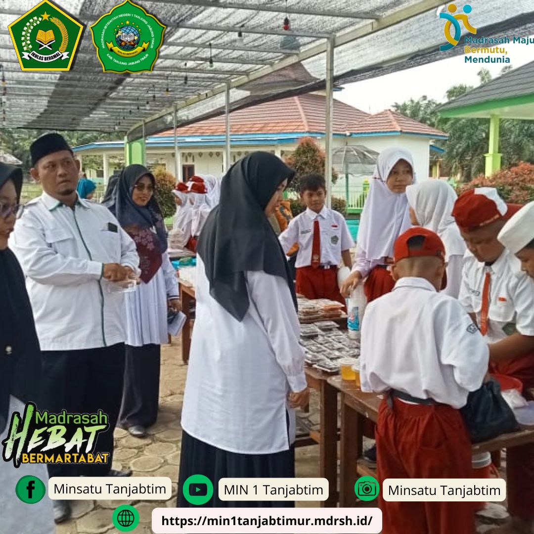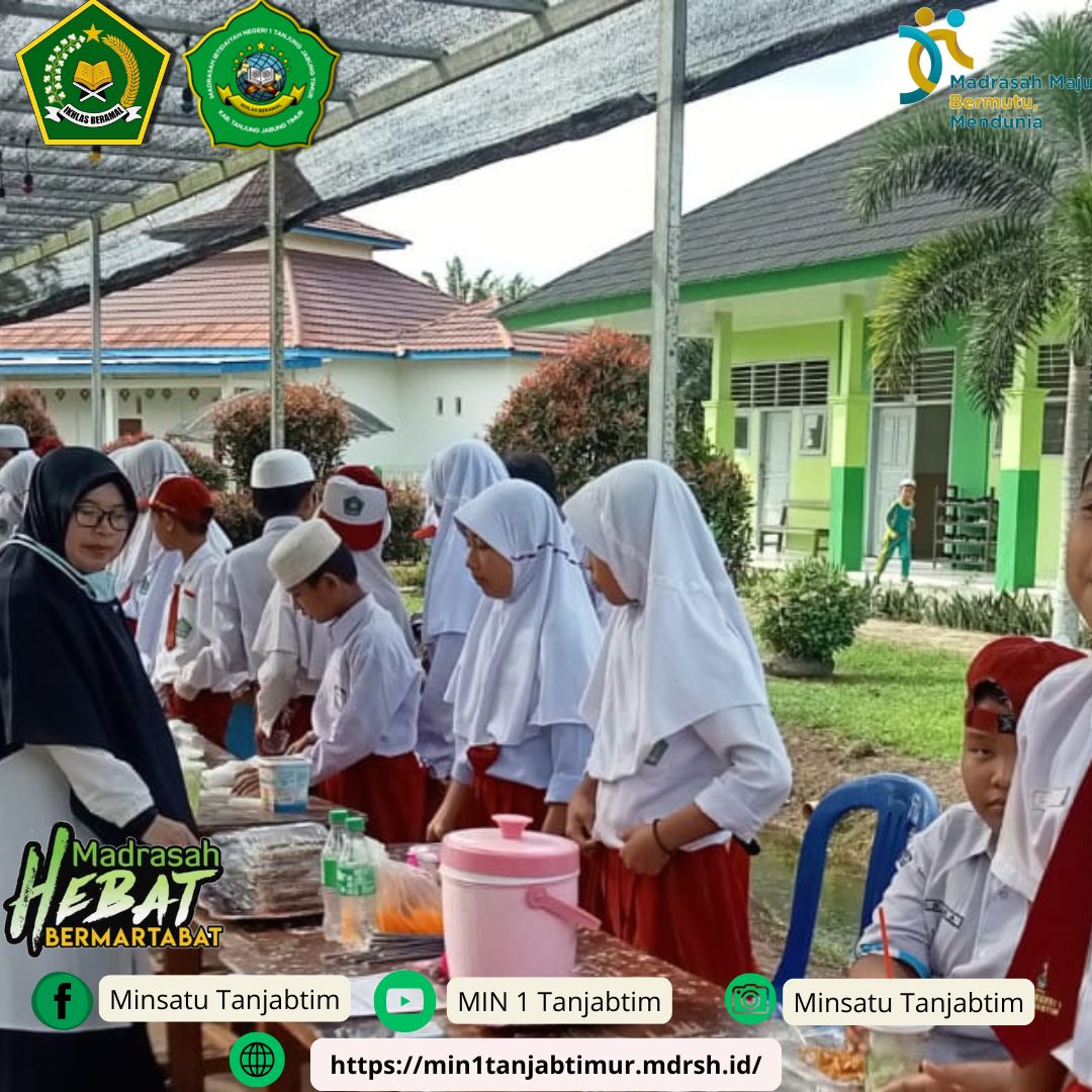 Rantau Rasau,MIN 1 Tanjab Timur - Pemandangan yang tidak biasa di Madrasah Ibtidayah Negeri (MIN) 1 Tanjab Timur pada Selasa (11/2/2025) pagi sekira pukul 09.00 Wib. Bagaimana tidak, sepanjang pintu masuk kedua, meja meja jualan berjajar rapi, aneka minuman dan makanan menghiasi meja tersebut.Â