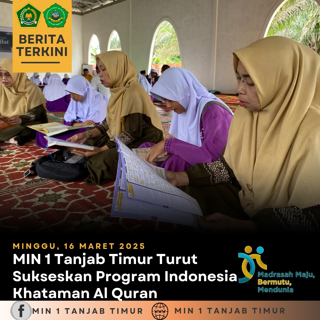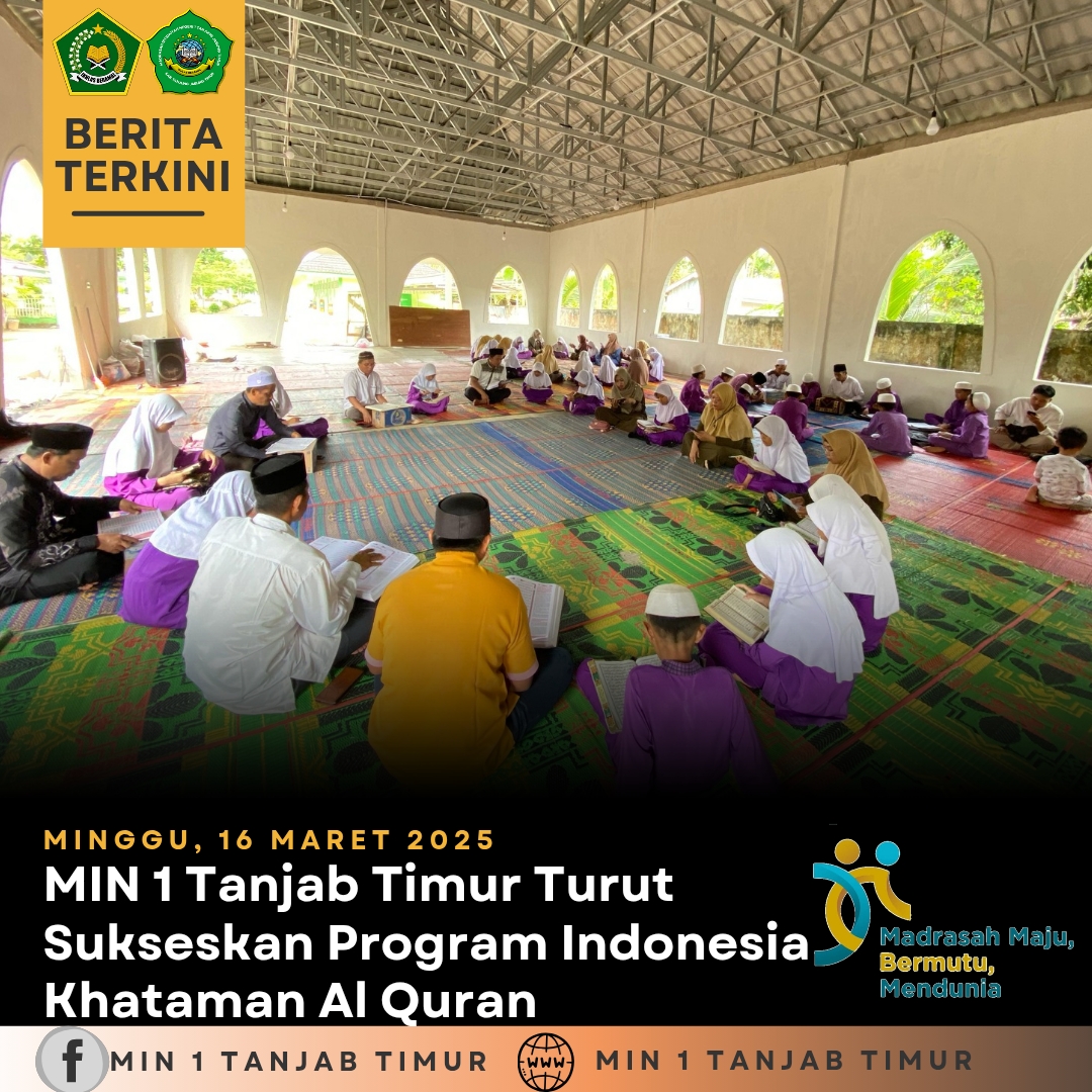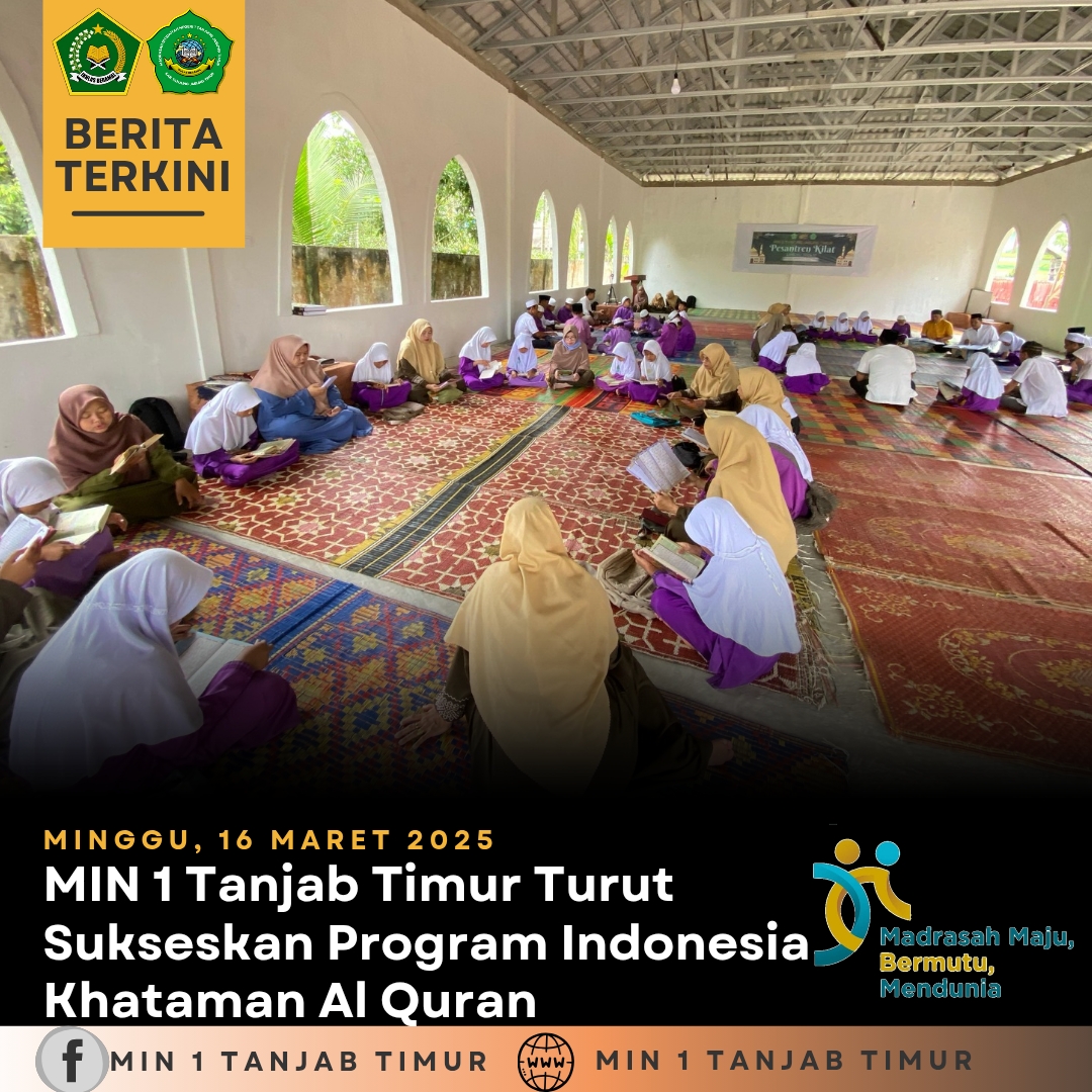 "Kegiatan khataman ini merupakan cara MIN 1 Tanjab Timur turut mensukseskan program Indonesia Khataman Al Quran yang di selenggarakan Kementrian Agama Republik Indonesia (RI) . Untuk di MIN sendiri kita pusatkan kegiatannya di gedung Aula Serba Guna dan diikuti oleh kurang lebih 63 orang, yang terdiri dari majelis guru dan siswa MIN 1 Tanjab Timur," ujar Kepala MIN 1 Tanjab Timur, Aziz,S.Pd.