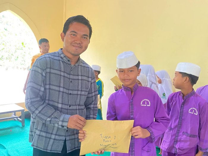 "Alhamdulillah hari ini usai sholat dhuha bersama kita, dapat memberikan hadiah dari perlombaan nyanyi lagu melayu solo dan Lomba Kecakapan Baris Berbaris (LKBB) yang diselenggarakan pemerintah Kecamatan Rantau Rasau beberapa waktu lalu. Lalu hari ini juga kita menyerahkan hadiah perlombaan main bola corong, makan roti, estafet pipet dan guling sarung helm," ujar Aziz.