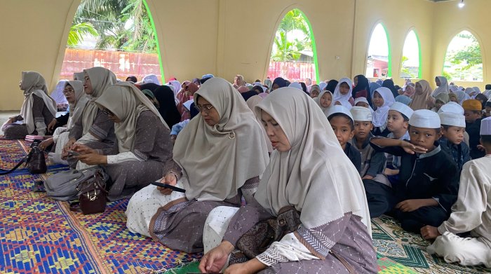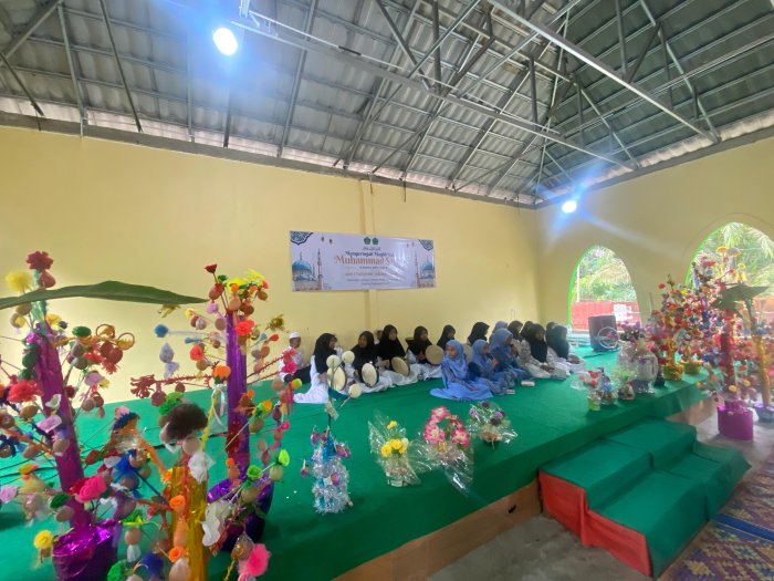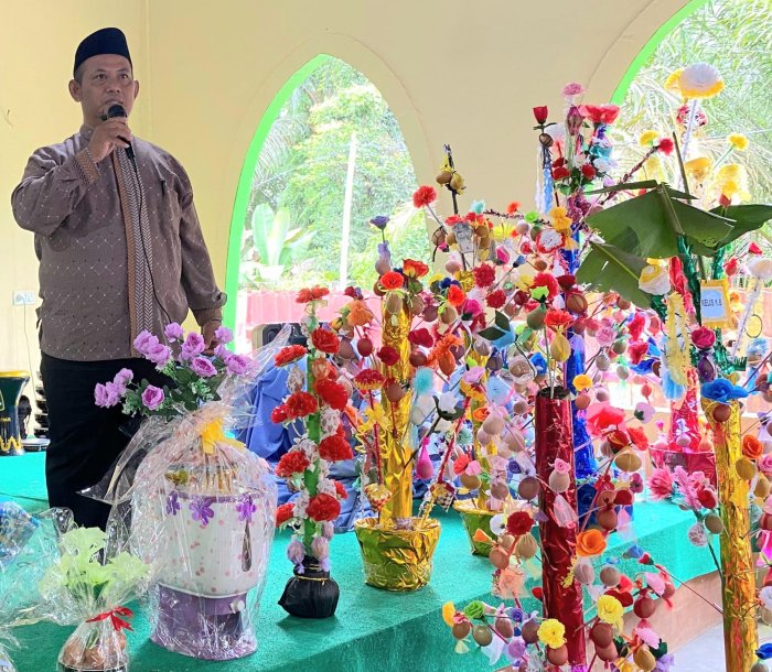 Rantau Rasau,MIN 1 Tanjab Timur - Saat peringatan Maulid Nabi Muhammad SAW di Madrasah Ibtidaiyah Negeri (MIN) 1 Tanjab Timur di gedung serba guna Sabtu (13/9/2025) kemarin, panggung acara tampak cantik dan unik. Kenapa tidak, didepan panggung terdapat barisan batang pisang yang dihiasi telor dengan berbagai bentuk dan macam bunga.