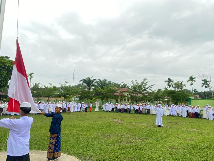 Upacara ini diikuti oleh siswa, guru, serta staf MIN 1 Tanjab Timur. Mereka tampak mengenakan pakaian muslim rapi dan tertib selama prosesi berlangsung. Meski cuaca kurang bersahabat, para peserta tetap antusias dan tidak meninggalkan barisan.