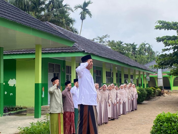 Rantau Rasau,MIN 1 Tanjab Timur - Madrasah Ibtidaiyah Negeri (MIN) 1 Tanjab Timur menggelar upacara peringatan Hari Santri pada Rabu (22/10/2025). Meskipun hujan gerimis turun sejak pagi, seluruh peserta tetap mengikuti upacara dengan khidmat dan penuh semangat di halaman madrasah.