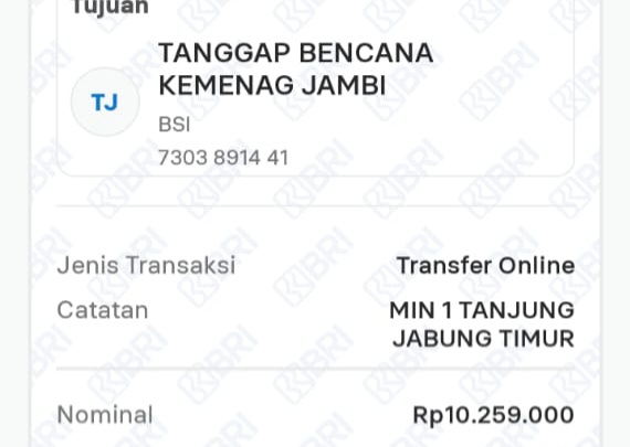 " Hal ini juga berarti donasi yang telah kita kumpulkan sebesar 10.259.000, dimana 5.072.000,- berasal dari keluarga besar MIN 1 Tanjab Timur yang kita kumpulkan pada hari Rabu dan Kamis kemarin. InsyAllah uang ini akan kita transfer ke Tanggap Bencana Kementrian Agama Provinsi Jambi," tambahnya.