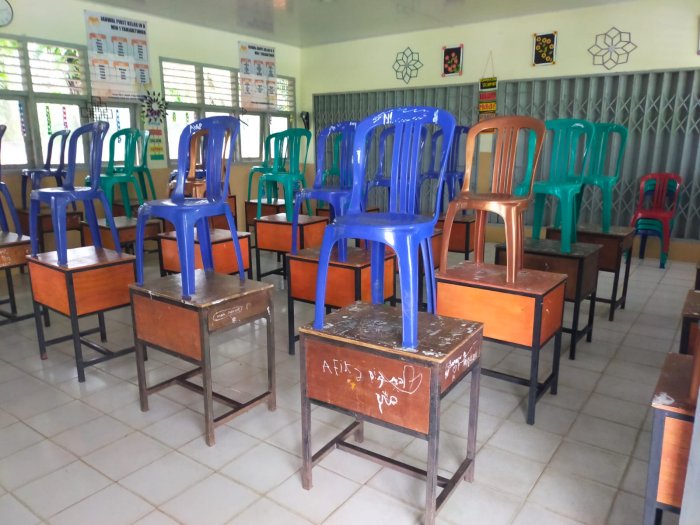 Para guru nampak bahu-membahu melakukan berbagai hal, seperti membersihkan debu pada meja dan kursi serta penataan ulang tata letak kelas agar tercipta suasana baru yang lebih segar.