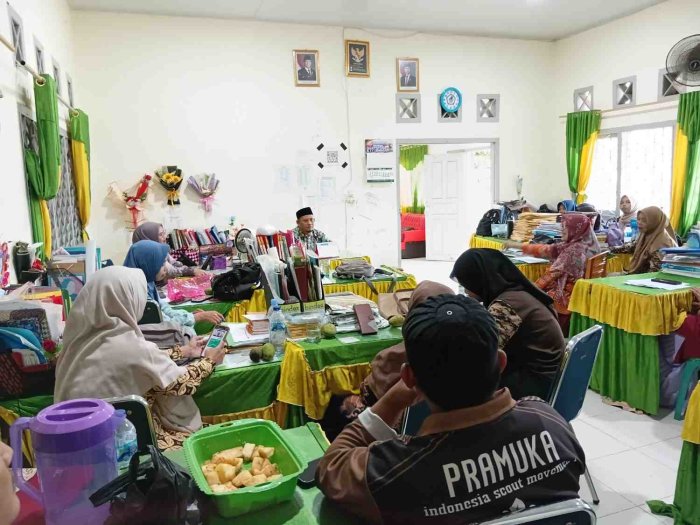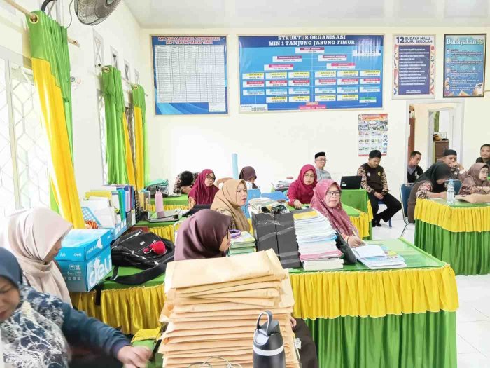 Rantau Rasau,MIN 1 Tanjab Timur - Menyongsong tahun ajaran baru, majelis guru Madrasah Ibtidaiyah Negeri (MIN) 1 Tanjab Timur menggelar rapat koordinasi terkait persiapan Penerimaan Murid Baru Madrasah (PMBM). Rapat yang dipimpin langsung oleh Kepala MIN 1 Tanjab Timur, Aziz,S.Pd ini membahas strategi sosialisasi yang akan menyasar lembaga pendidikan anak usia dini di wilayah sekitar Rantau Rasau.